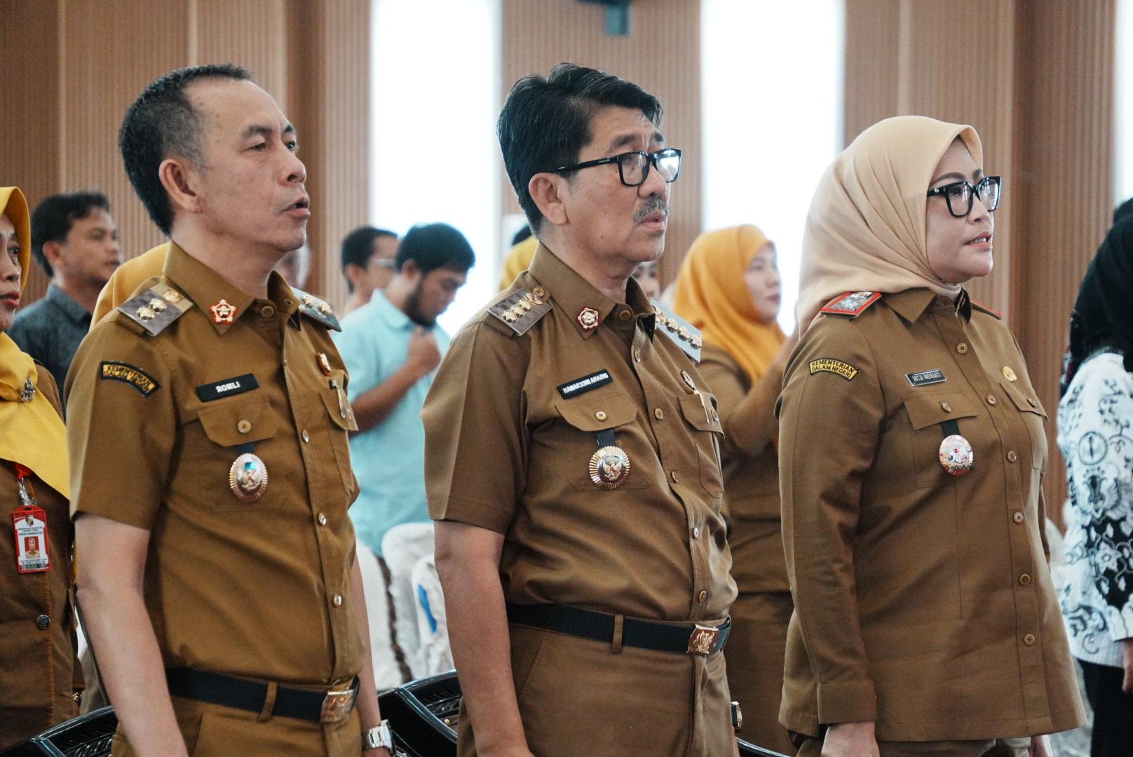 Tampak suasana di dalam gedung tersebut dipadati para pejabat di lingkungan Pemerintah Kabupaten Lampung Utara beserta para tamu undangan. Bahkan, Bupati dan Wakil Bupati turut hadir pula dengan mengenakan seragam kebesaran Aparatur Sipil Negara dengan warna khas Kuning Kaki lengkap dengan atributnya.
